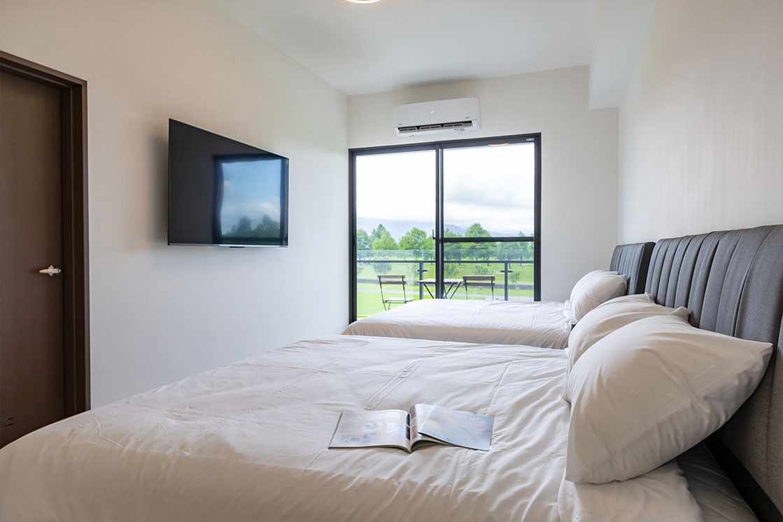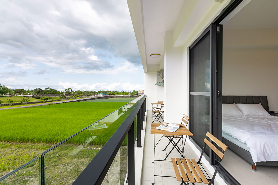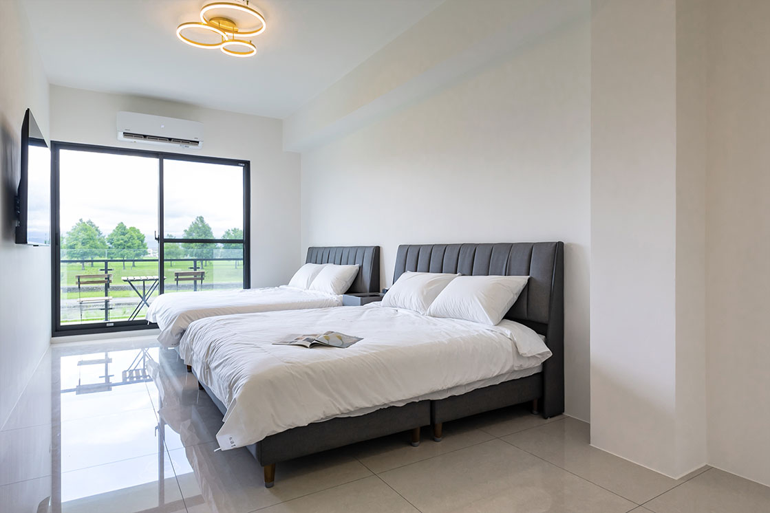 四間舒適四人套房,擁有大面窗景與戶外陽台,正對安農溪畔及整排的落羽松群,飽覽這大片靜謐美景。
