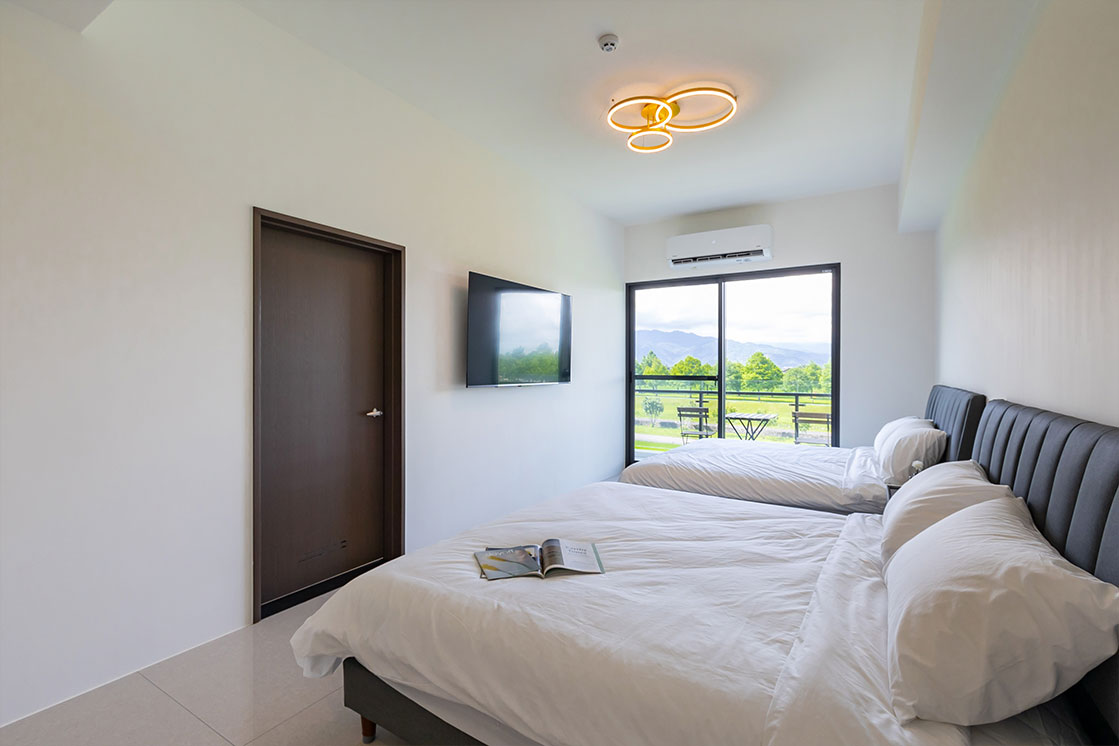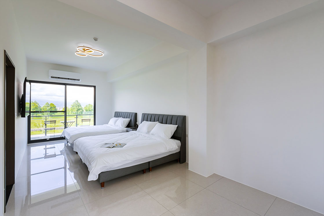 四間舒適四人套房,擁有大面窗景與戶外陽台,正對安農溪畔及整排的落羽松群,飽覽這大片靜謐美景。